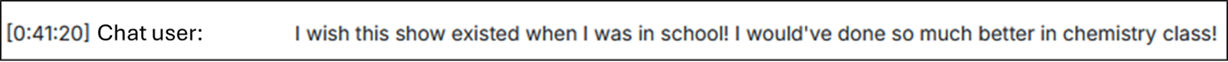 Coded stream observations to identify how online communities form around science content, how viewers connect STEM concepts to their daily lives, and how different types of participants engage with learning